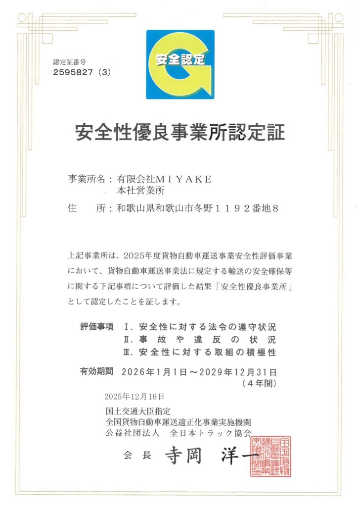 有限会社 三宅運送 Gマーク認定取得 - 2022年1月1日〜2025年12月31日